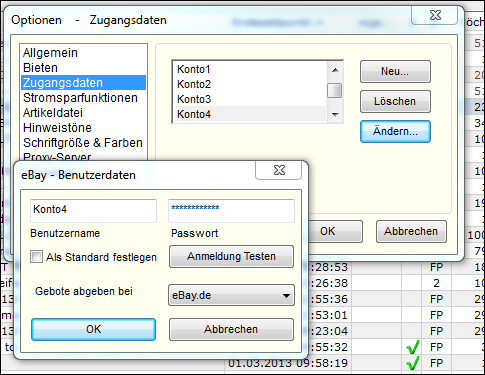 SchnapperPro erlaubt es, beliebig viele eBay-Konten zu hinterlegen. Für jedes hinterlegte Konto kann die eBay-Domain festgelegt werden, auf der die Gebote abgegeben werden.